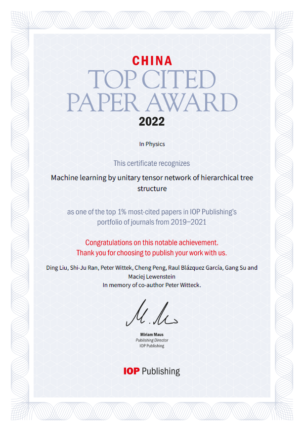 近日,我院青年教师刘丁为第一作者的研究论文Machine Learning by Unitary Tensor Network of Hierarchical Tree Structure获得英国物理学会出版社(Institute of Physics Publishing)颁发的2022高被引论文奖(Top Cited Paper Award 2022)。该奖项表彰英国物理学会旗下诸学术期刊所发表的在过去三年中被引数前百分之一(Top 1%)的优秀论文。