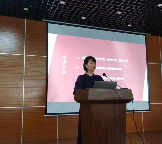 张霞老师以《推动构建人类命运共同体》为题,以人类命运共同体理念提出十周年为契机,从世界之问、中国之答和中国之路三个层面深入阐述了推动构建人类命运共同体的重要意义。张老师讲到,面对“世界怎么了、我们怎么办”这个世界难题,习近平总书记提出了中国智慧和中国方案——推动构建人类命运共同体,实现共赢共享。十年来,人类命运共同体的内涵不断丰富发展,实践不断走深走实,和平、发展、公平、正义、民主、自由的全人类共同价值日益深入人心,建设持久和平、普遍安全、共同繁荣、开放包容、清洁美丽的世界,已成为引领时代潮流和人类前进方向的鲜明旗帜。新时代我们要全面推进中国特色大国外交,牢牢把握服务民族复兴、促进人类进步这条主线,通过推动建设新型国际关系,积极参与全球治理体系改革,推动构建人类命运共同体,携手开创人类更加美好未来。