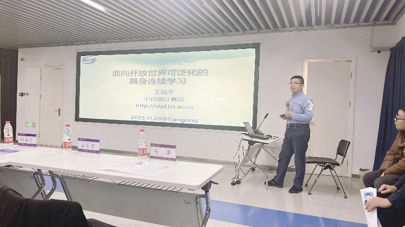 随后,中科院计算所王瑞平研究员聚焦“面向开放世界可泛化的具身连续学习”,深刻分析了具身智能从封闭环境走向开放通用时面临的挑战。他通过介绍课题组开发的基于棋盘格表示的R2C交互框架、示教视频指导代码生成的RoboPro框架等具体工作,探讨了如何建立系统性的具身连续学习范式,从而实现智能体在开放动态环境下的知识精进与能力泛化。